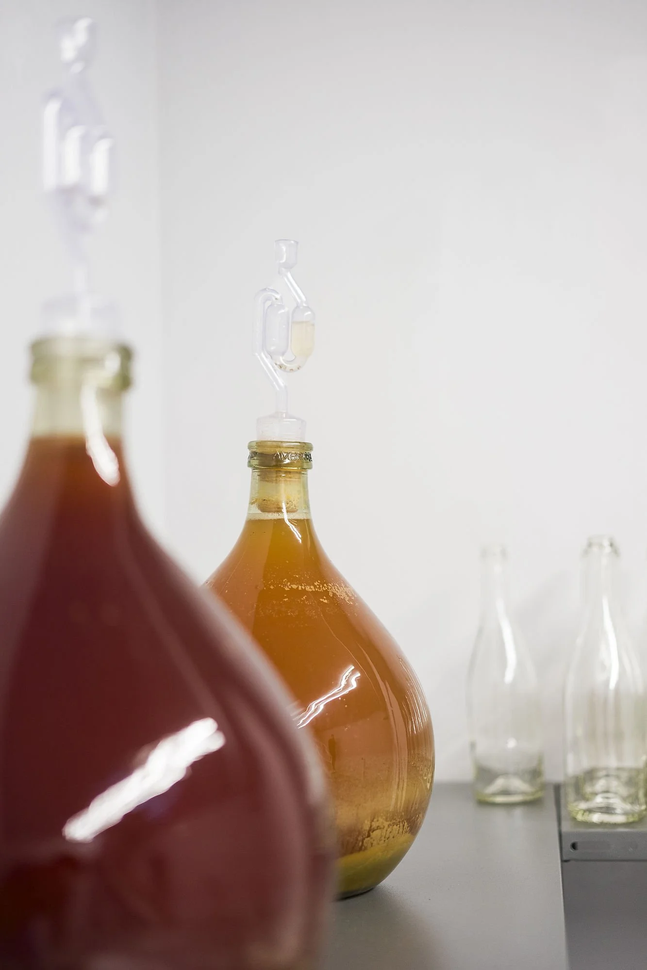 installation which includes 3 demijohns with wine fermentation made with Pinot Grigio and Refosco grapes,