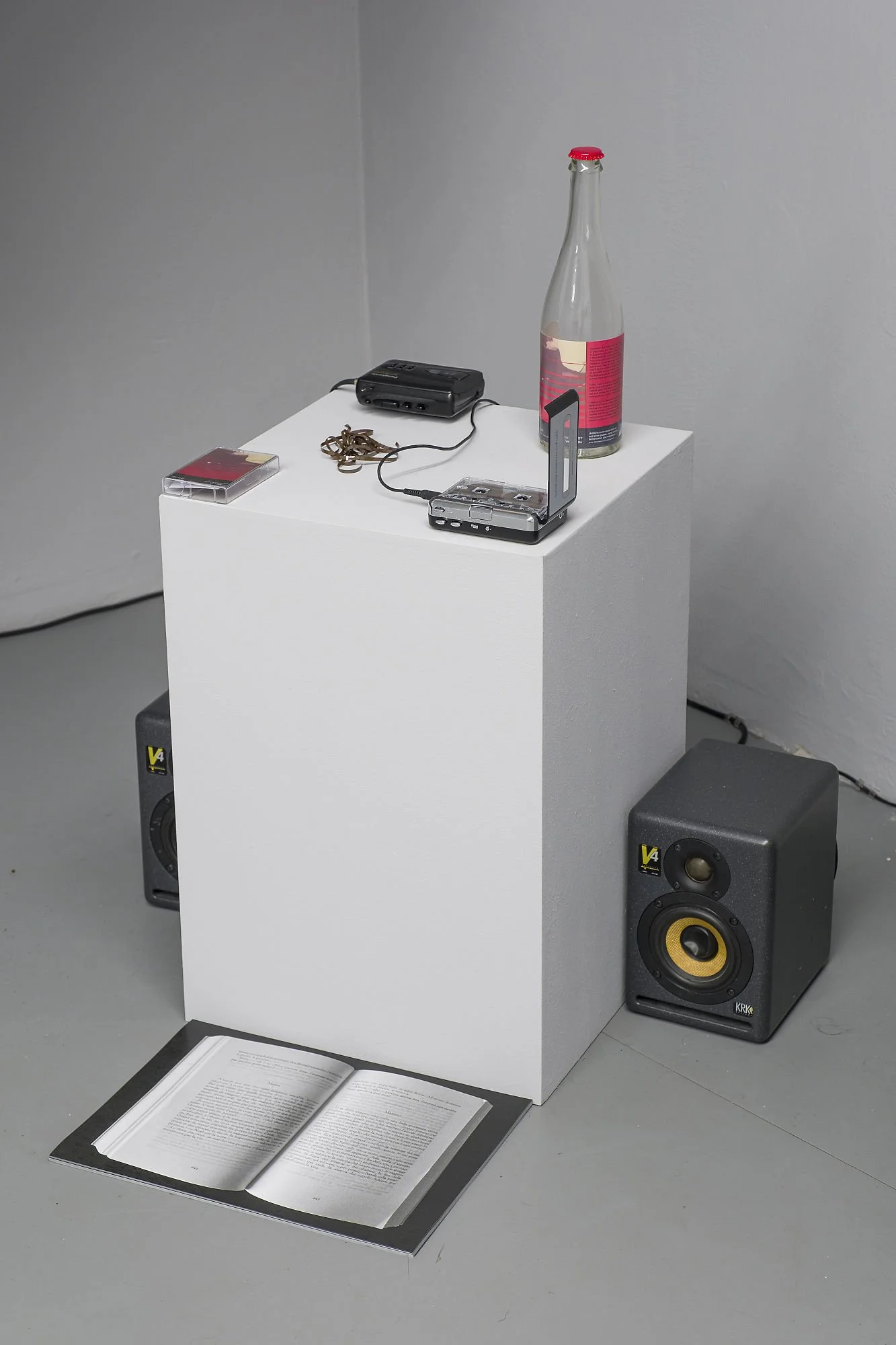 installation witch includes 2 portable cassette players and one bottle, 2024